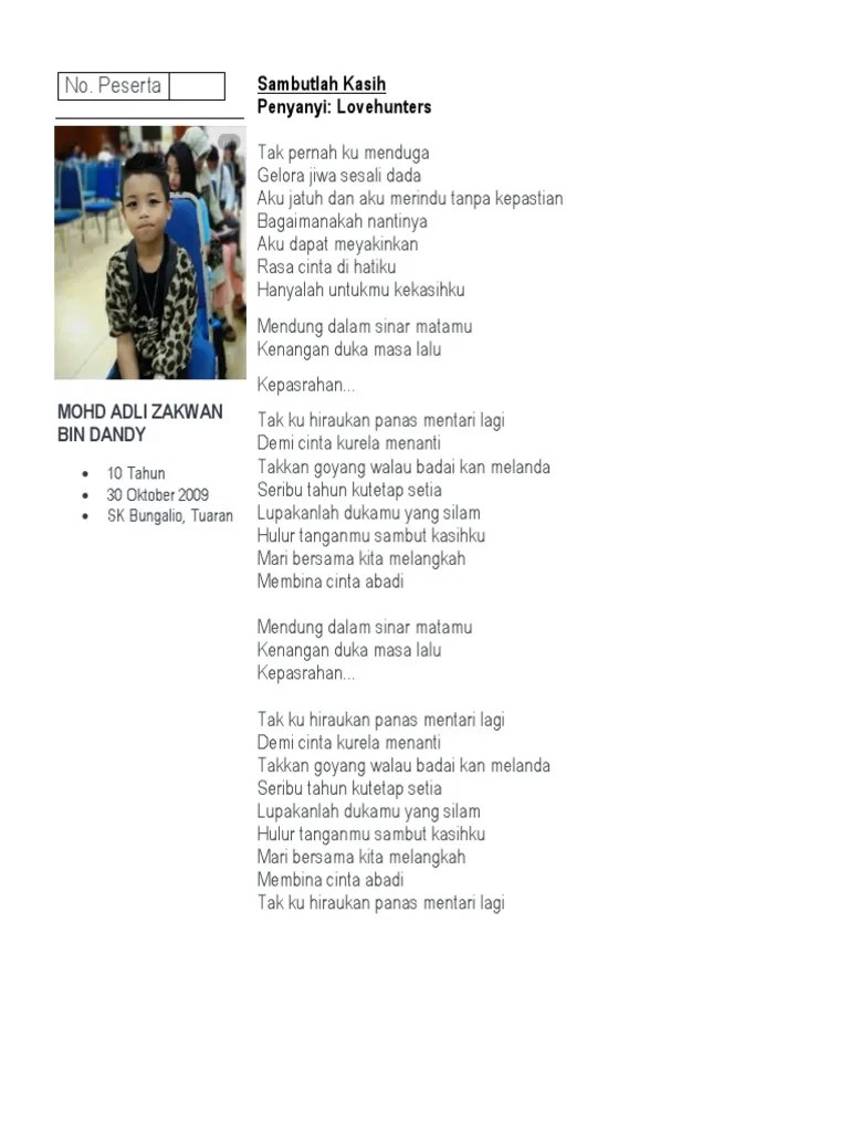 Lyrics for sambutlah kasihku by love hunters. Tak pernah ku menduga gelora jiwa sesali dada aku jatuh dan aku merindu tanpa kepastian bagaiman. Gelora jiwa sesal di dada. Aku jatuh dan aku merindu tanpa kepastian.